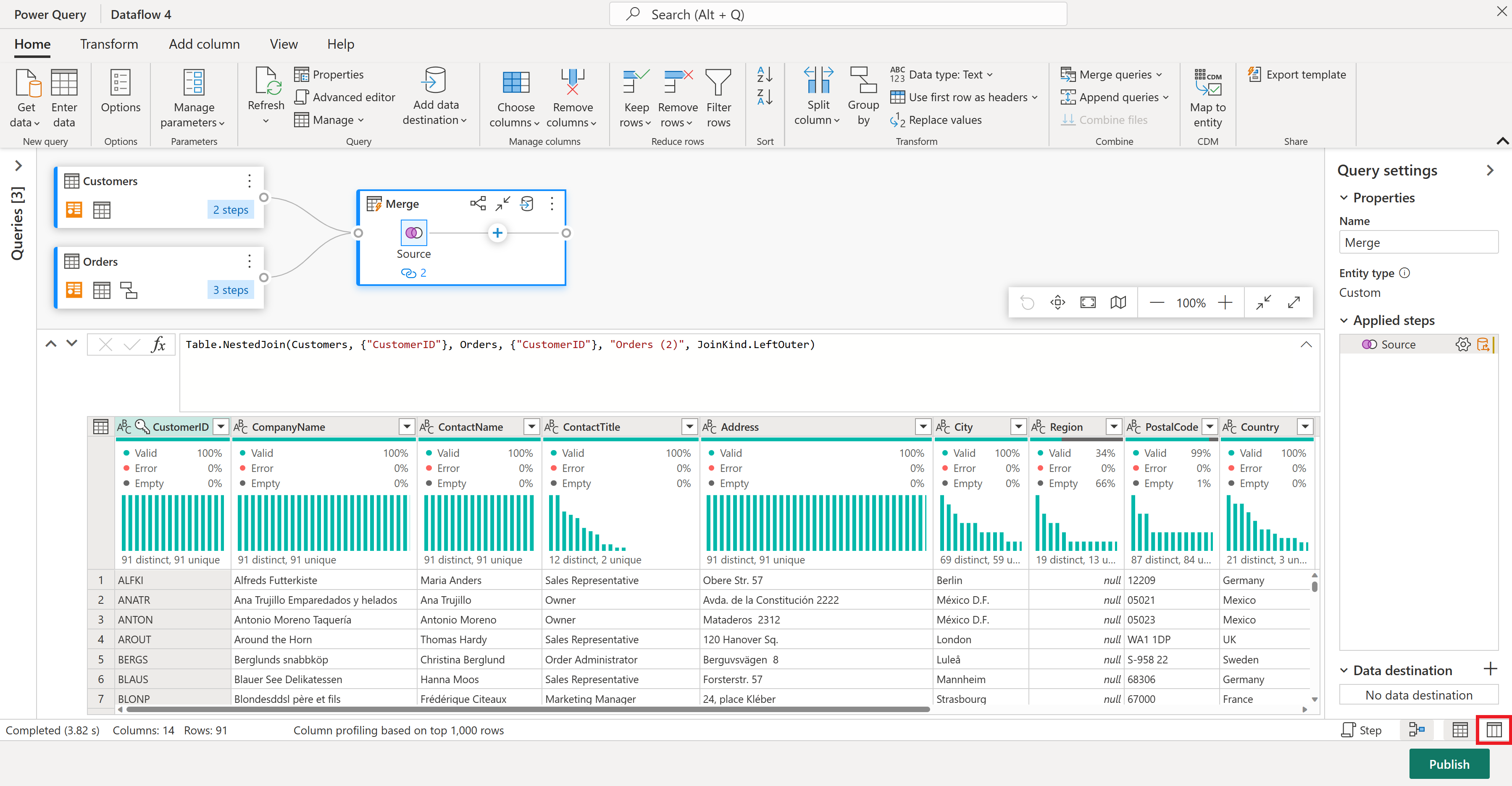 Nu finns det en ny fråga med alla kolumner från tabellen Kunder och en kolumn med kapslade data från tabellen Beställningar.