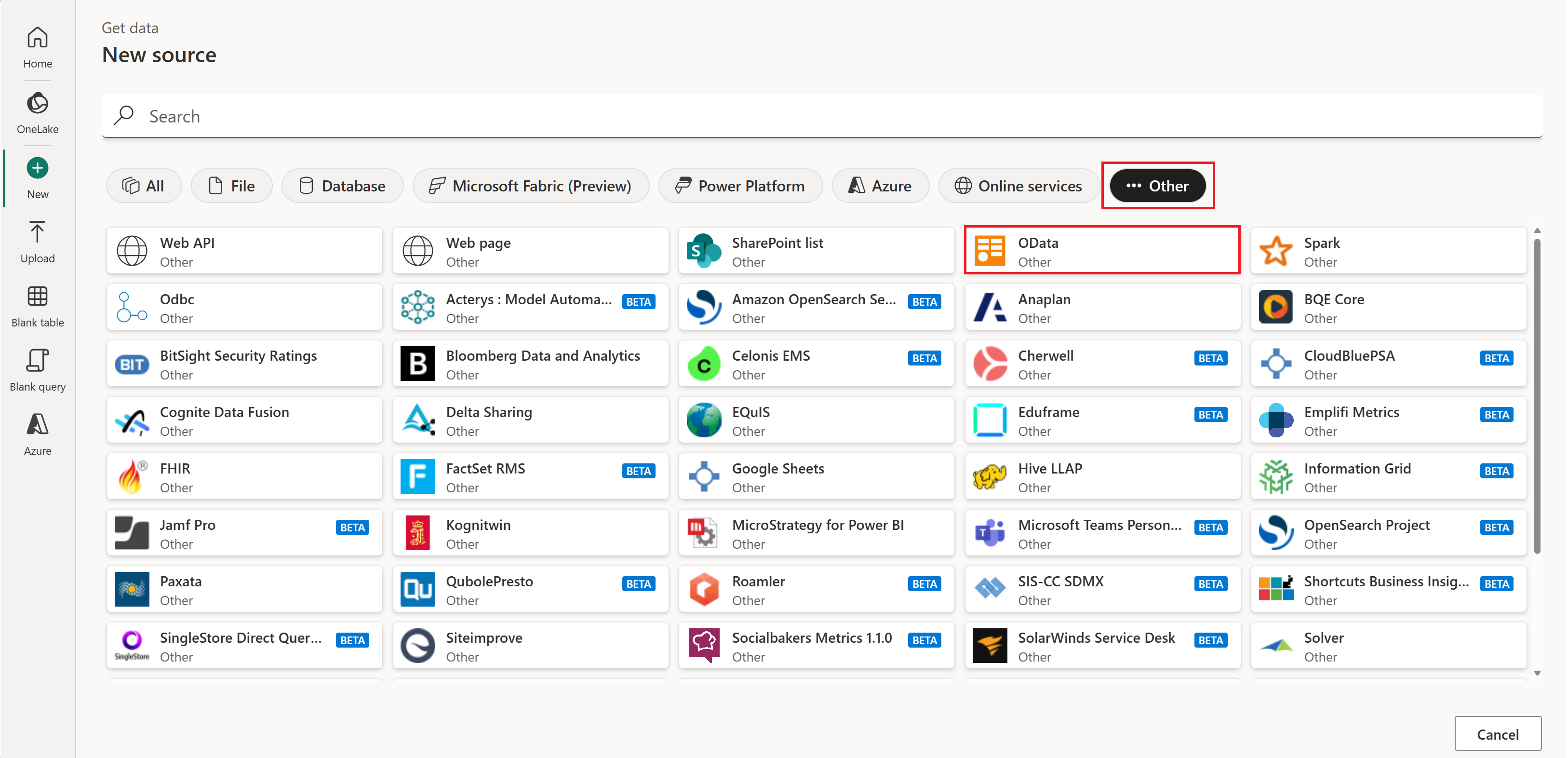 Nu ska vi hämta lite data! I det här exemplet får du data från en OData-tjänst. Använd följande steg för att hämta data i ditt dataflöde.