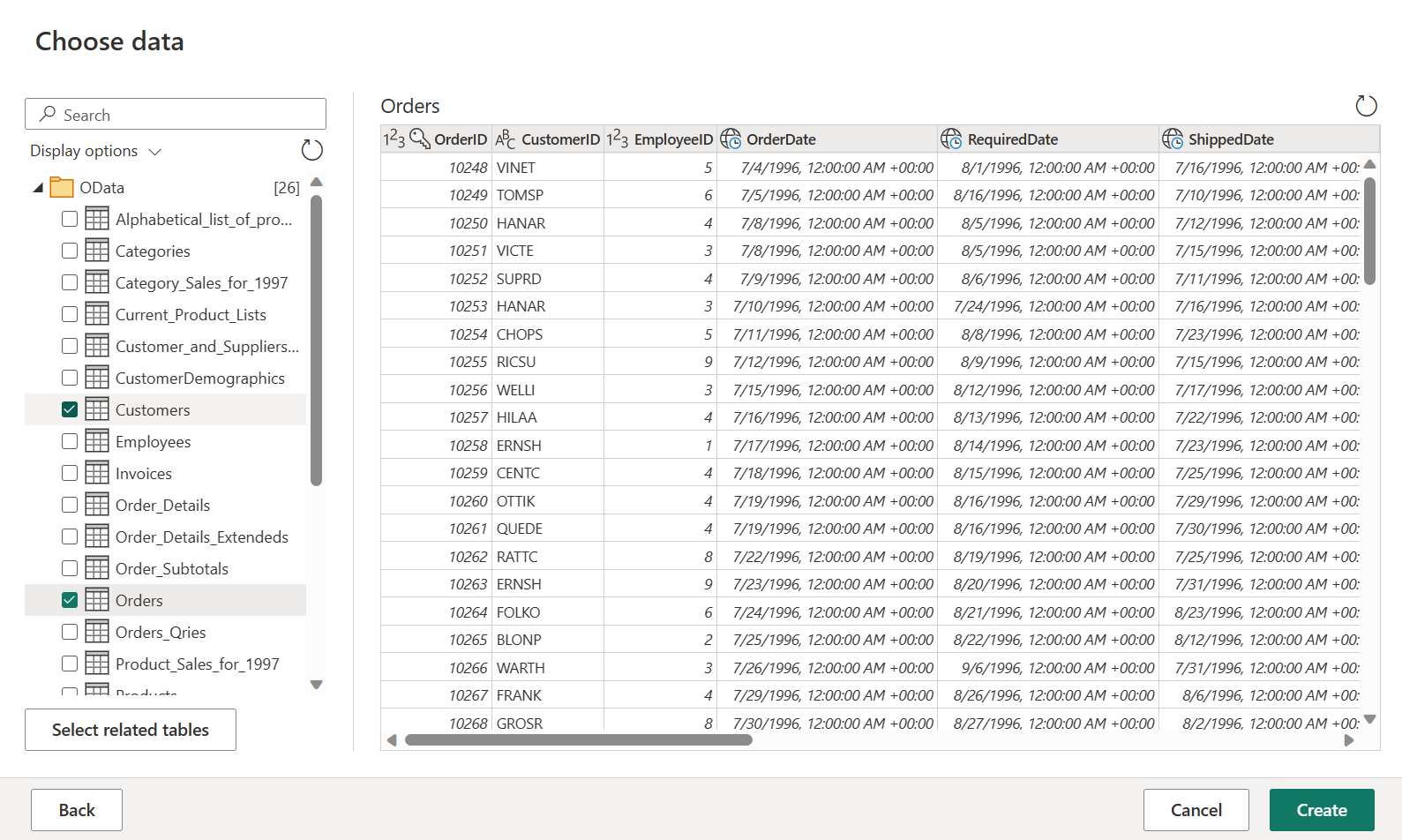 Välj tabellerna Beställningar och Kunder och välj sedan Skapa.