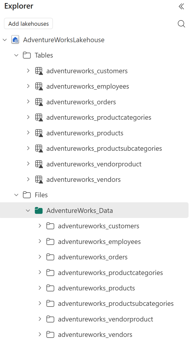 Ditt lakehouse bör nu innehålla den uppladdade mappen AdventureWorks_Data med datafilerna.