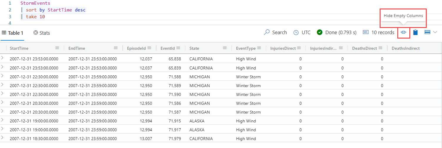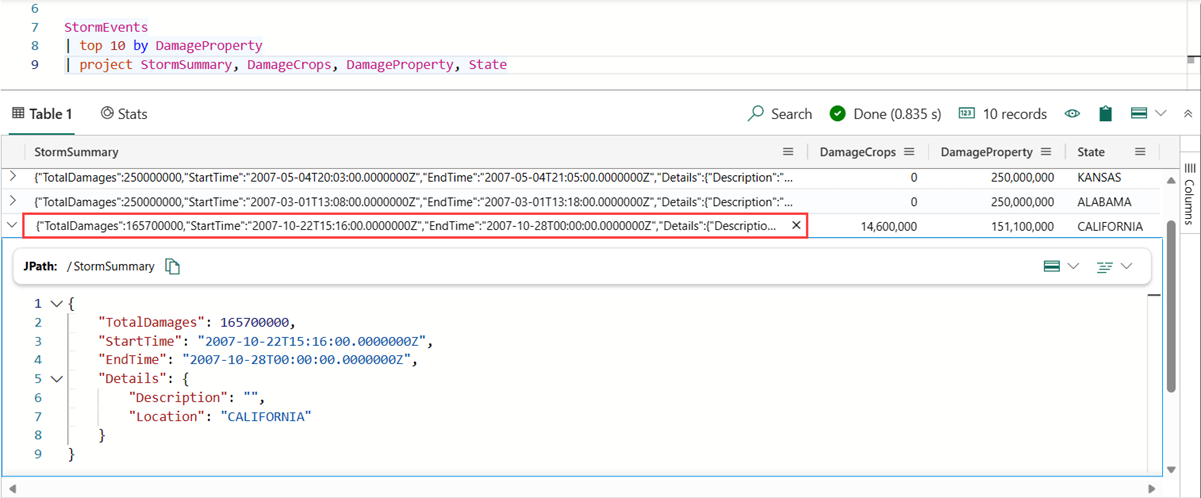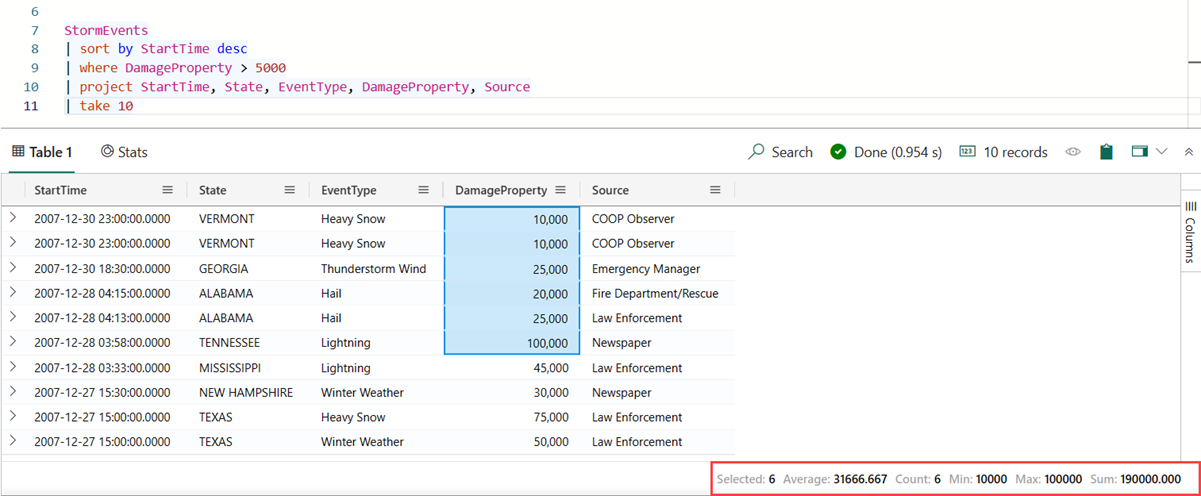 StormEvents | sort by StartTime desc | where DamageProperty > 5000 | project StartTime, State, EventType, DamageProperty, Source | take 10I resultatfönstret väljer du några av de numeriska cellerna. Med tabellrutnätet kan du välja flera rader, kolumner och celler och beräkna sammansättningar på dem. Följande funktioner stöds för numeriska värden: Average, Count, Min, Maxoch Sum.
