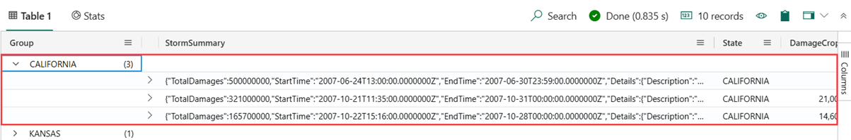 StormEvents | sort by StartTime desc | take 10Hovra över kolumnen State, välj menyn och välj Gruppera efter delstat.