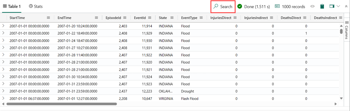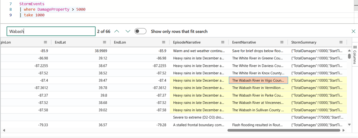 StormEvents | where DamageProperty > 5000 | take 1000Välj knappen Sök till höger och skriv "Wabash"