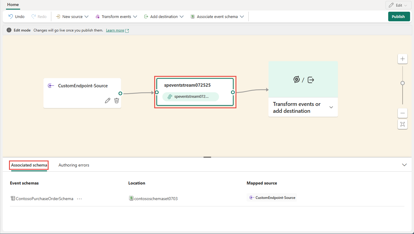 När du har skapat den anpassade slutpunktskällan läggs den till i din eventstream på arbetsytan i redigeringsläge. Om du vill implementera nyligen tillagda data från den anpassade appkällan väljer du Publicera.