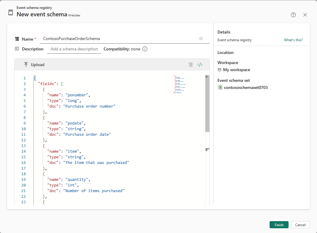 Om du har en JSON-schemafil väljer du Ladda upp för att ladda upp filen. En exempelfil finns i Ladda ned ett händelseschema.