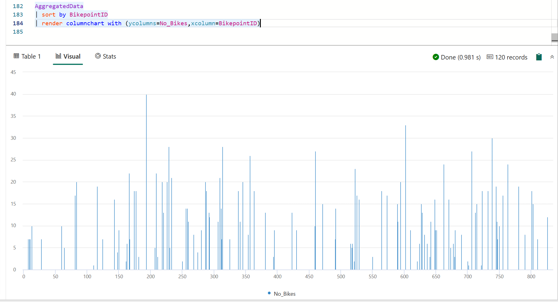 I din KQL-frågeuppsättning kopierar du, klistrar in och kör följande fråga. Du kanske redan har kört den här frågan från föregående avsnitt i den här handledningen. Den här frågan returnerar ett kolumndiagram som visar det senaste antalet cyklar av BikepointID.