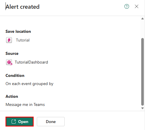 Fält Värde Detaljer Regelnamn Varning om högt antal cyklar Monitor Kör alla frågor 5 minuter Tillstånd Kontrollera På varje händelse grupperad efter* Grupperingsfält No_Bikes När BikepointID Tillstånd Är större än Value 30 förekomst Varje gång villkoret uppfylls Action Välj åtgärd Meddelande till enskilda användare till Ditt Teams-användarnamn Rubrik Aktiveringsvarning - Varning för högt cykelantal Notes Villkoret för avisering om högt antal cyklar har uppfyllts Spara plats Workspace Arbetsytan där självstudieresurserna finns Objekt Handledning Välj Skapa. När du ser meddelandet om lyckat resultat väljer du Öppna.