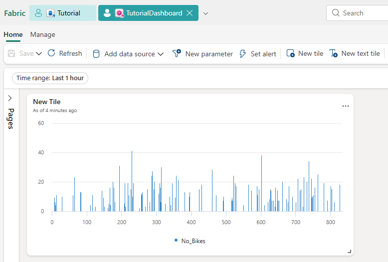 AggregatedData | sort by BikepointID | render columnchart with (ycolumns=No_Bikes,xcolumn=BikepointID)Välj Spara till instrumentpanelen>Ny Realtidsinstrumentpanel.