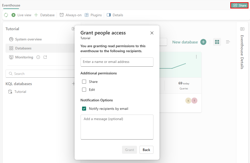 Öppna händelsehuset Självstudie , välj Databaser och välj knappen Dela .