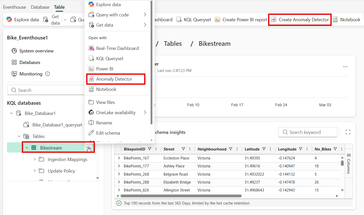 - Under Alla dataströmmar väljer du eventhouse-tabellen TransformedData som du skapade i föregående självstudie. Sidan med tabellinformation öppnas. Välj Identifiera avvikelser på den översta menyn.