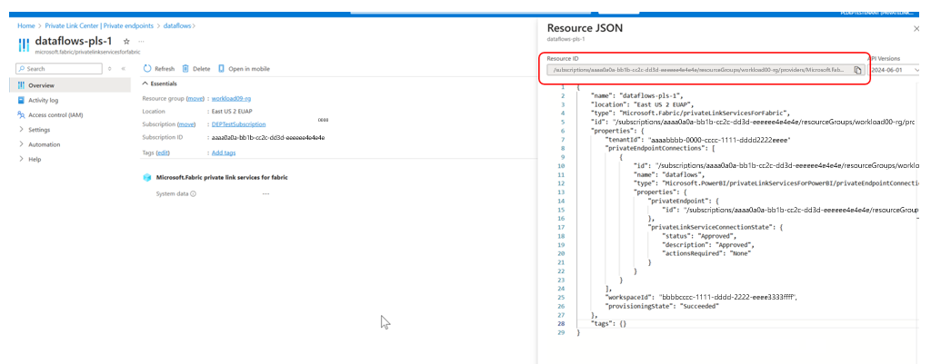 Om du vill skapa en hanterad privat slutpunkt till målarbetsytan behöver du Azure Private Link-tjänstens resurs-ID för målarbetsytan. Du hittar det här resurs-ID:t i Azure genom att visa resurs-JSON för arbetsytan. Kontrollera att arbetsytans ID i JSON matchar den avsedda målarbetsytan.