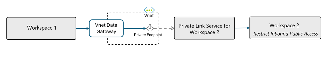 Du kan använda en virtuell nätverksdatagateway eller en lokal datagateway (OPDG) för att upprätta kommunikation mellan arbetsytor med en arbetsyta som har en princip som begränsar inkommande offentlig åtkomst. Med båda alternativen måste du skapa en privat slutpunkt i det virtuella nätverk som innehåller datagatewayen. Den här privata slutpunkten ska peka på Private Link-tjänsten för målarbetsytan.