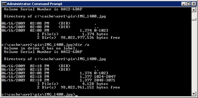 Locate the folder where IMG_1400.jpg should be located on the cache drive location and list the contents by typing dir /a.