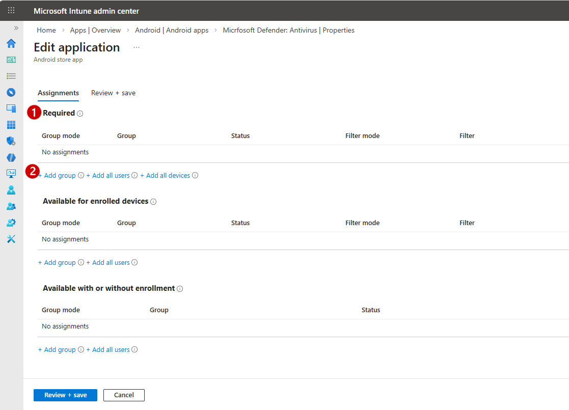 På sidan Android-appar i Intune administrationscenter väljer du Microsoft Defender: Antivirus i applistan. Gå till Egenskaper (1) och för Tilldelningar väljer du Redigera (2).