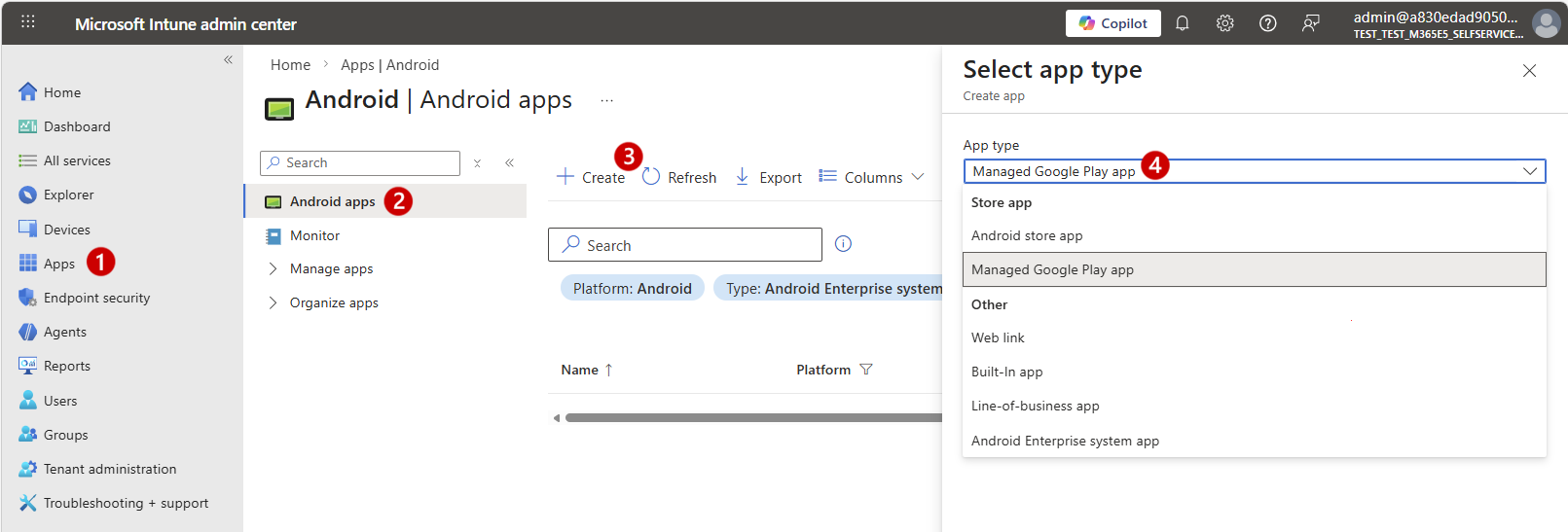 I Microsoft Intune administrationscenter går du till Appar (1) och väljer sedan Android-panelen för att öppna sidan Android-appar (2). Välj Skapa (3) och för Apptyp väljer du Hanterad Google Play-app (4) och sedan Välj.