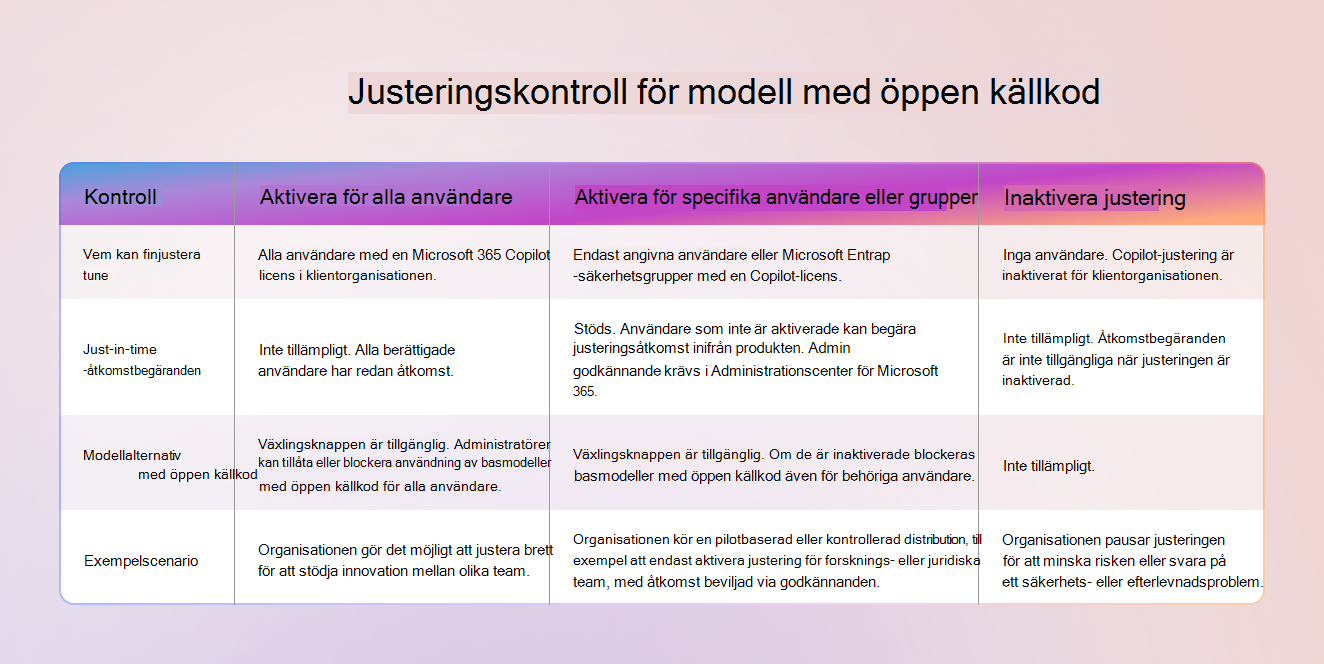 | Vem kan finjustera | Alla användare med en Microsoft 365 Copilot licens i klientorganisationen. | Endast angivna användare eller Microsoft Entra säkerhetsgrupper med en Copilot-licens. | Inga användare. Copilot-justering är inaktiverat för klientorganisationen. |