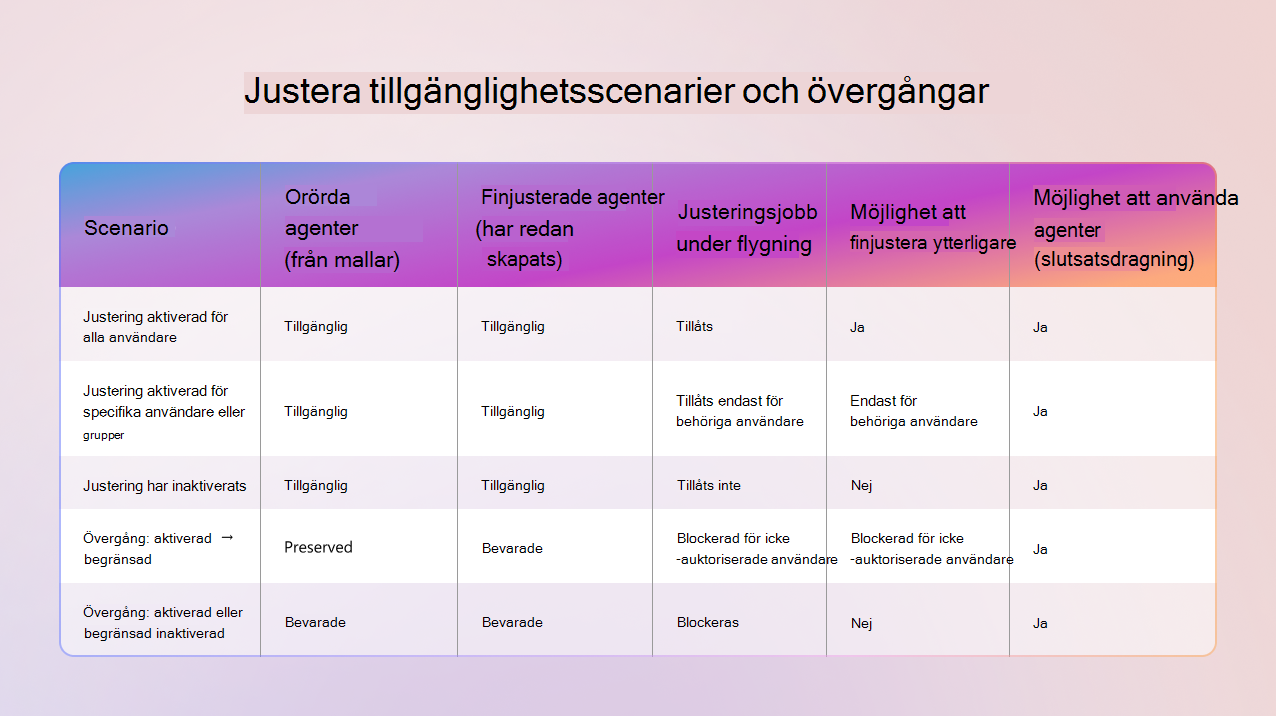 Ändringar i Copilot-justering tillgänglighet är framåtblickande. Att justera vem som kan justera agenter – eller inaktivera justering helt – tar inte bort eller bryter agenter som redan finns.
