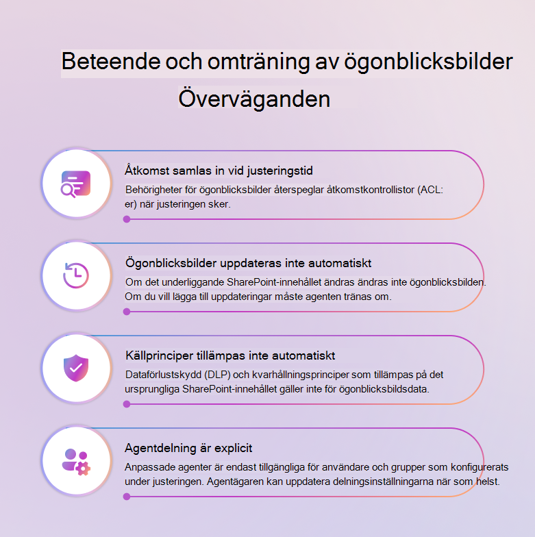 Om det underliggande SharePoint-innehållet ändras ändras inte ögonblicksbilden. Om du vill lägga till uppdateringar måste agenten tränas om.Källprinciper tillämpas inte automatiskt.