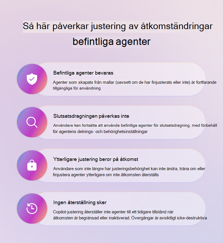 Copilot-justering återställer inte agenter till ett tidigare tillstånd när åtkomsten är begränsad eller inaktiverad. Övergångar är avsiktligt icke-destruktiva.