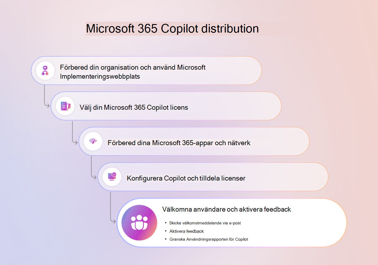 Som en del av din Microsoft 365 Copilot införande skickas ett välkomstmeddelande till dina Microsoft 365 Copilot användare med licenstilldelning som meddelar Microsoft 365 Copilot och dess funktioner. Du kan också aktivera feedback för Microsoft 365 Copilot användare.