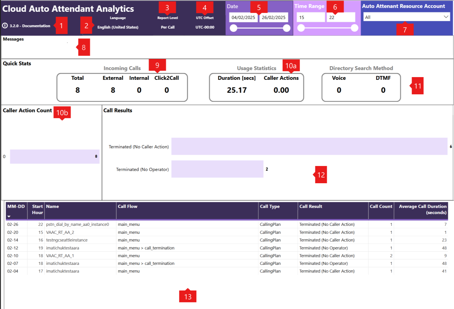 | 10a | Quick Stats -> Usage Statistics | The breakdown shows the average call duration in the Auto Attendant and the average number of caller actions. |