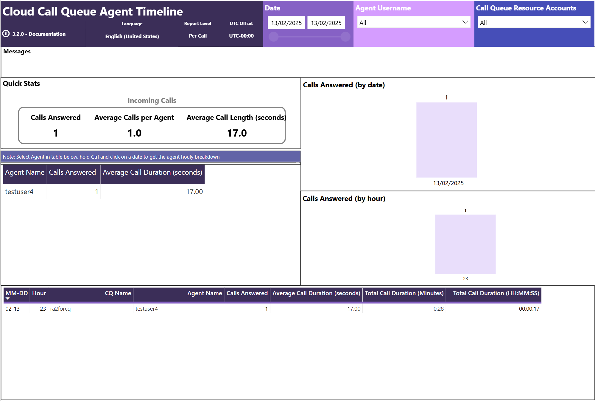 - The Agent Timeline report shows a timeline view of agents being active in Call queue calls.