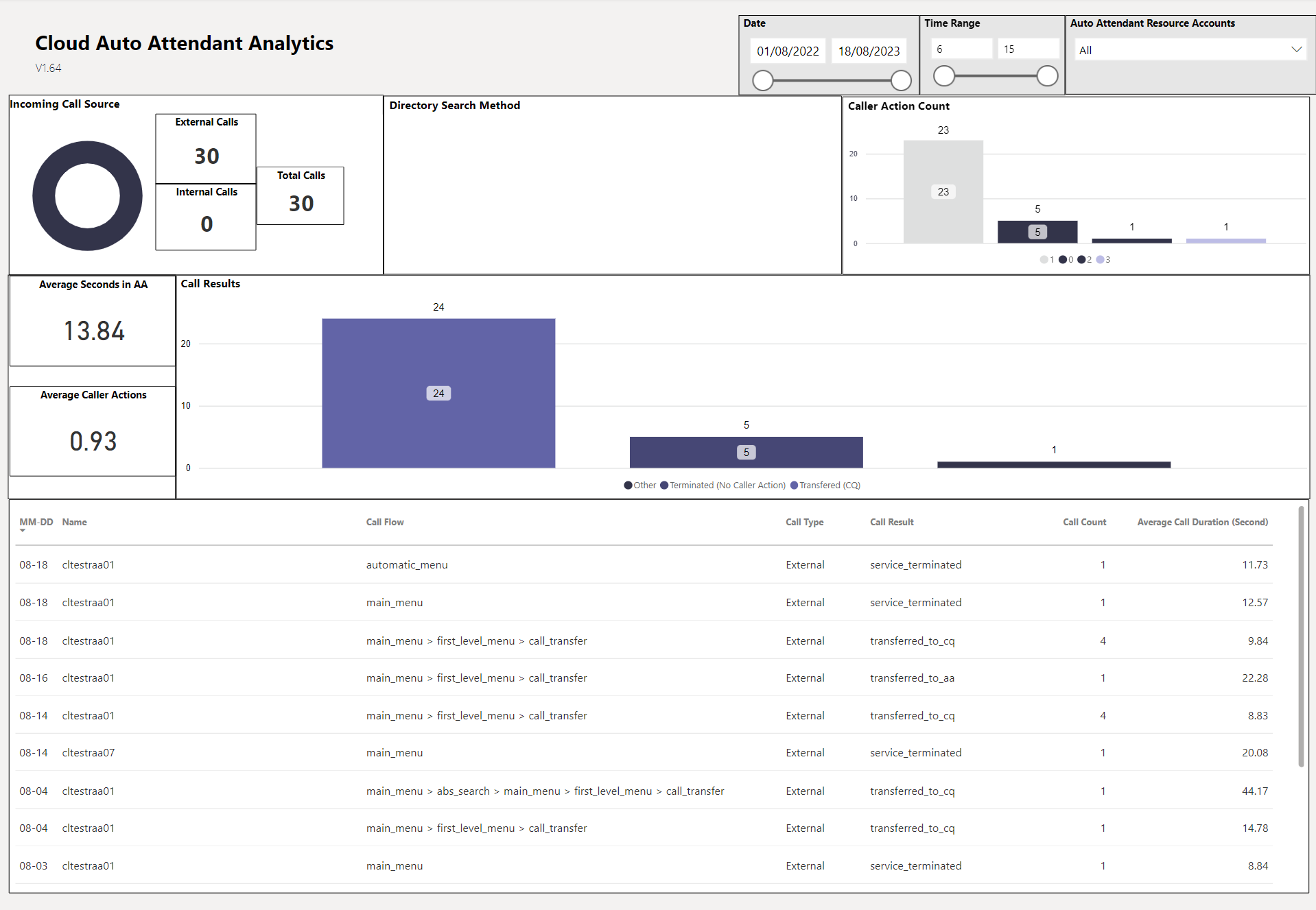 - Call queue and auto attendants are shown by the resource account's ID instead of call queue/auto attendant names. To show all the traffic for an auto attendant or call queue, you must select all the resource accounts assigned to the auto attendant or call queue.