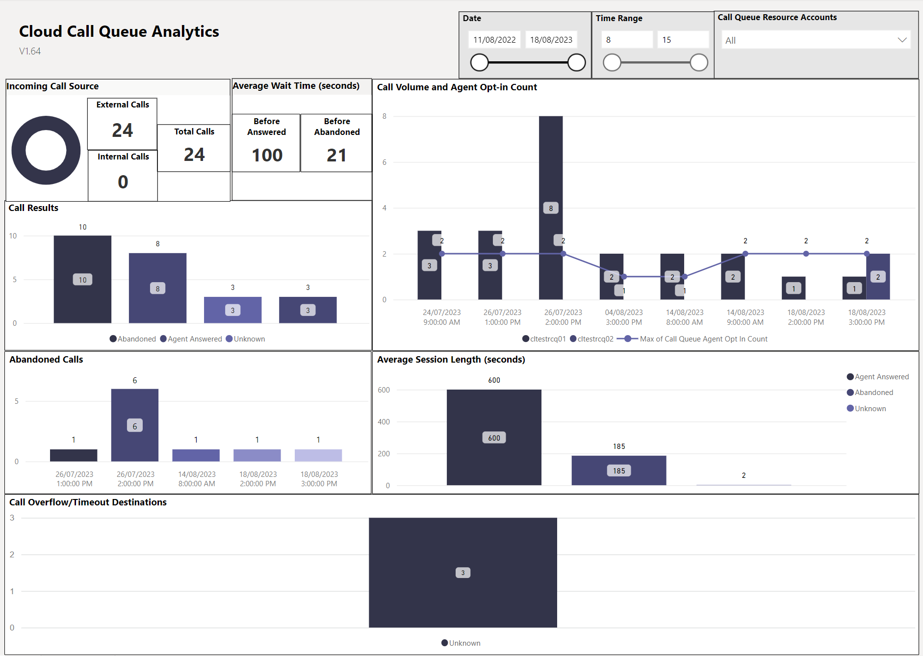 The Teams Auto Attendant & Call Queue Historical Report Power BI Template provides the following three reports: