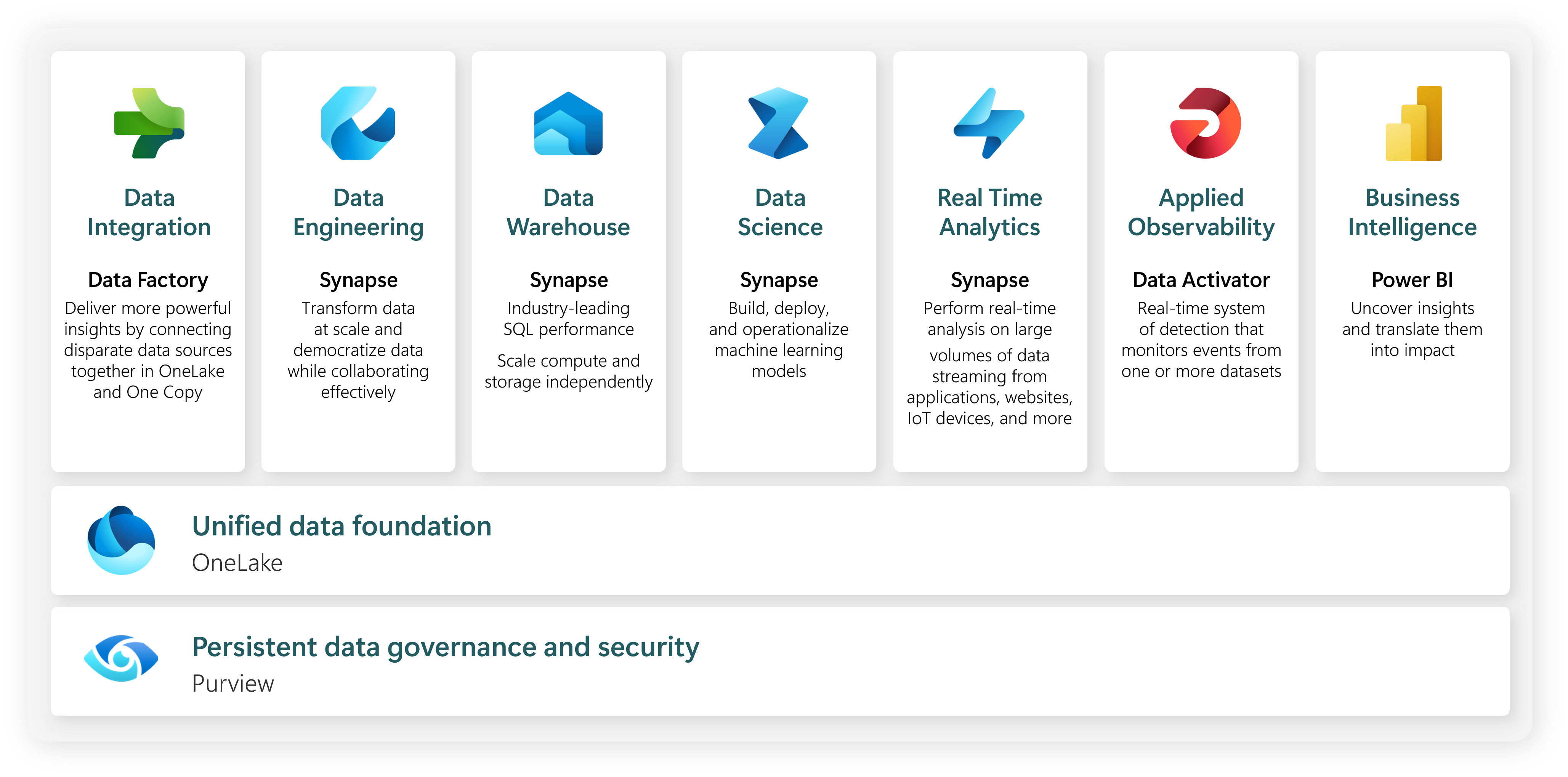 Microsoft Fabric är en komplett analys- och dataplattform utformad för företag som behöver en enhetlig lösning. Den omfattar dataförflyttning, bearbetning, insamling, omvandling, händelserouting i realtid och rapportuppbyggande. Den erbjuder en enhetlig uppsättning analystjänster, inklusive datateknik, datavetenskap, realtidsanalyser och datalagring med avancerad datakontroll och säkerhetskontroll.