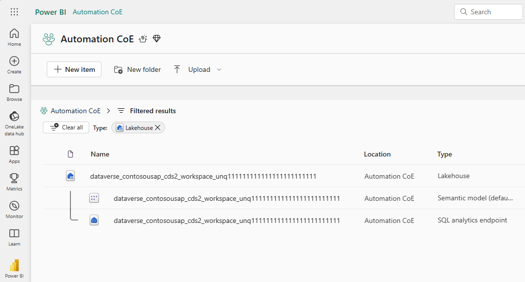 Följ de här stegen för att koppla din Dataverse-miljö till Microsoft Fabric. När du har länkat miljön ser du ett sjöhus, en semantisk modell och en slutpunkt för SQL-analys. Dessa objekt prefixas med "Dataverse," följt av ditt miljönamn och ett unikt suffix för miljön, till exempel