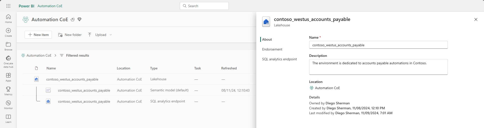 dataverse_contosousap_cds2_workspace_unq111111111111111111111111.(Valfritt) Välj inställningar för sjöhus, byt namn på ditt sjöhus till ett beskrivande namn, till exempel "contoso_westus_accounts_payable" och ge en kortfattad beskrivning. Den här förändringen hjälper andra att snabbt identifiera specifika automatiseringar och data som bearbetas i sjöhuset.