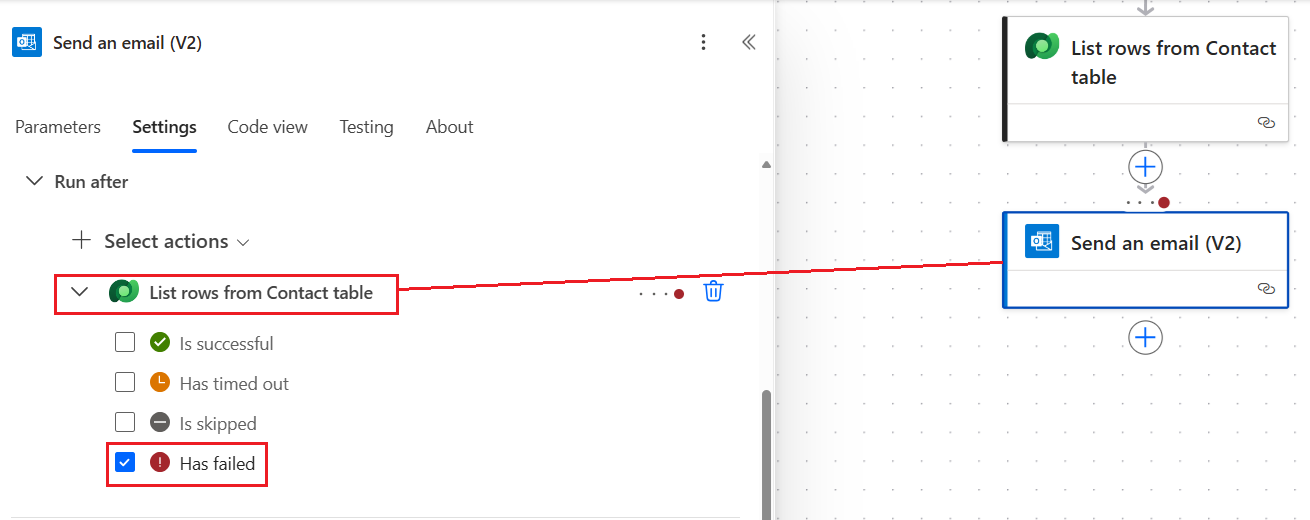 Använd inställningarna Kör efter för att ange vad som ska hända om en åtgärd misslyckas, överskrider tidsgränsen, hoppas över eller lyckas. För varje åtgärd kan du ange villkor för att bestämma nästa steg baserat på resultatet av föregående åtgärd. Med den här metoden kan du skapa alternativa sökvägar för felhantering. Om en åtgärd till exempel misslyckas kan du konfigurera för att skicka ett meddelande eller logga felinformationen som nästa åtgärd.