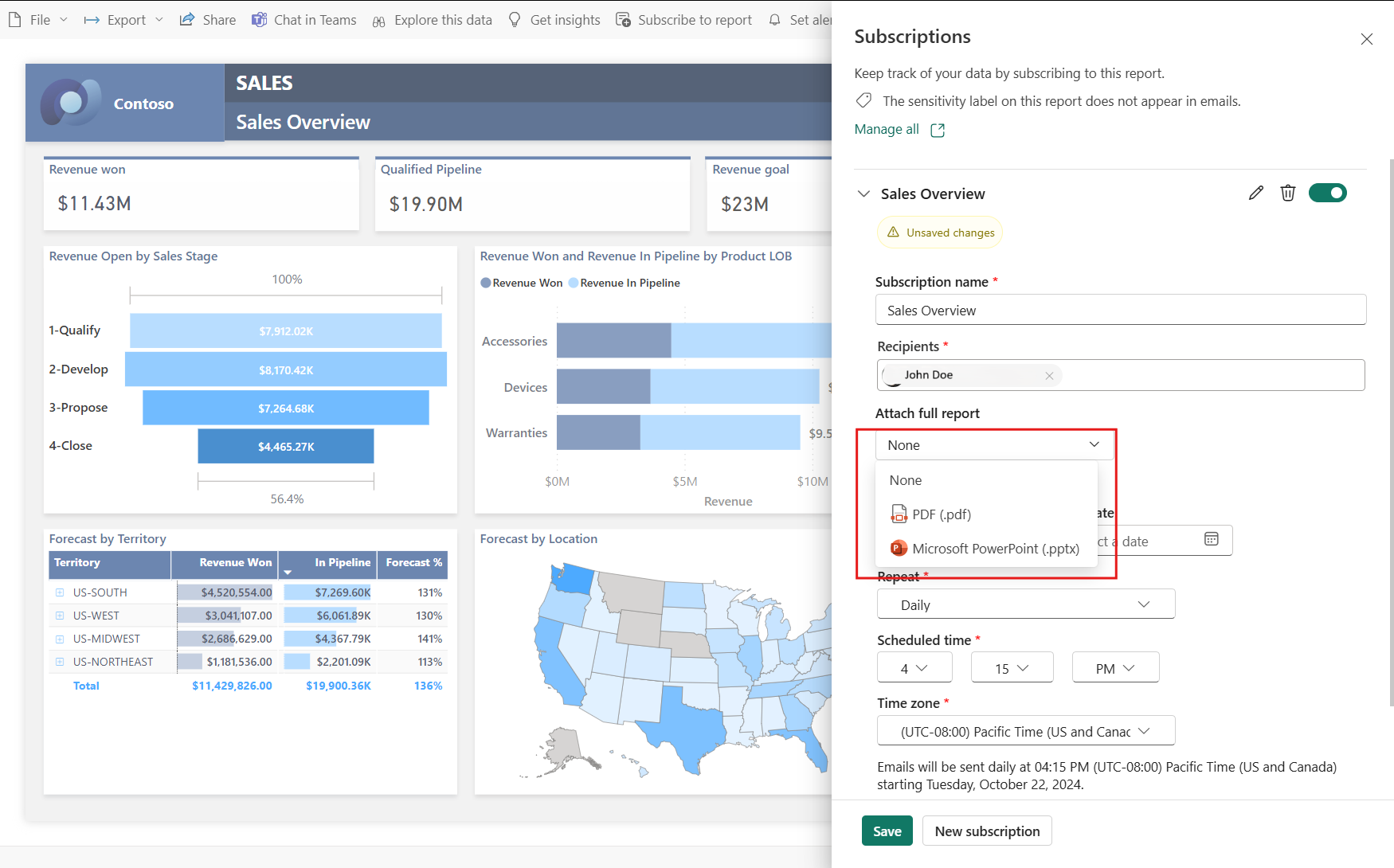 Schemalägg leveransen av rapporten genom att välja frekvensen (Dagligen, Varje vecka, Varje månad), Start- och Slutdatum. Läs mer om att skapa prenumerationer.