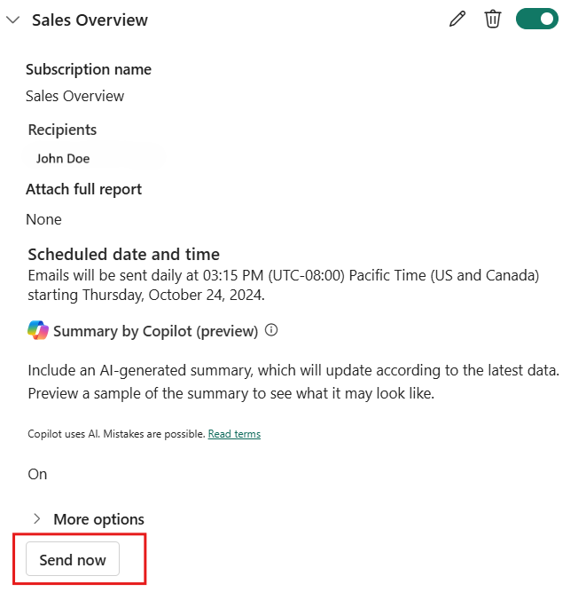 Du kan inkludera en Copilot-genererad sammanfattning för din Power BI-rapportsida eller en fullständig rapportbilaga i din e-postprenumeration för att få insikter. Alla mottagare av e-postprenumerationen får Copilot-sammanfattningen i e-postmeddelandet. Den här funktionen stöds för närvarande endast för standardprenumerationer.