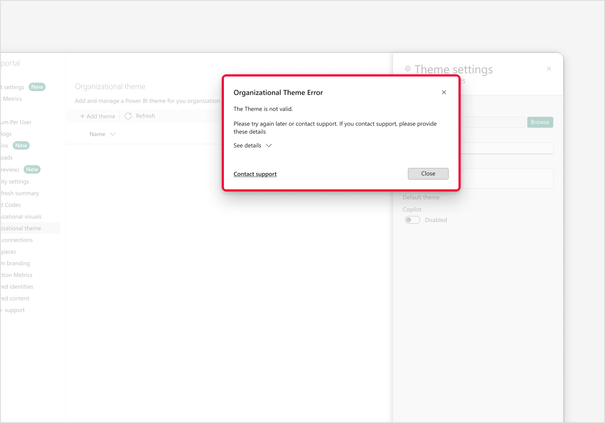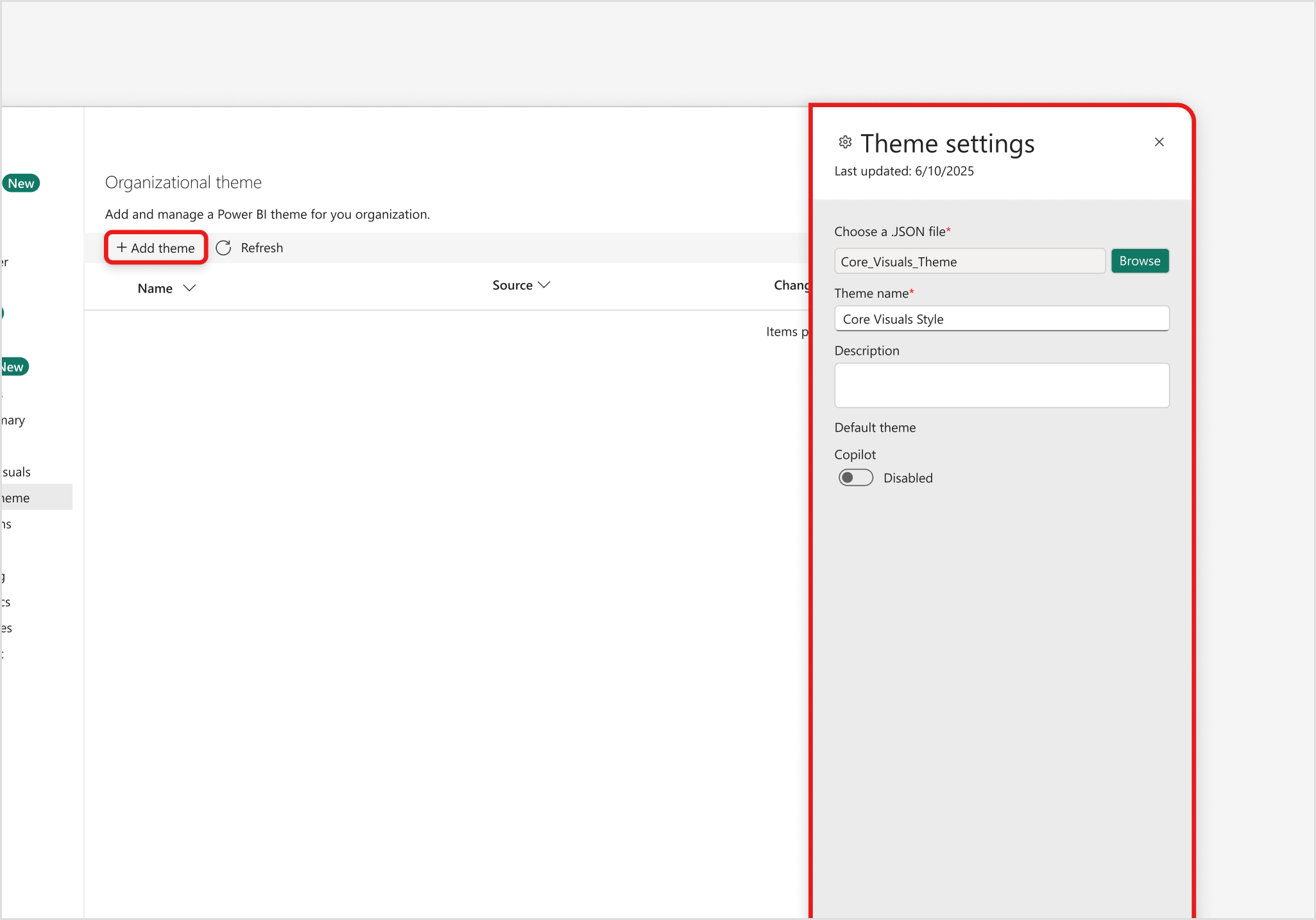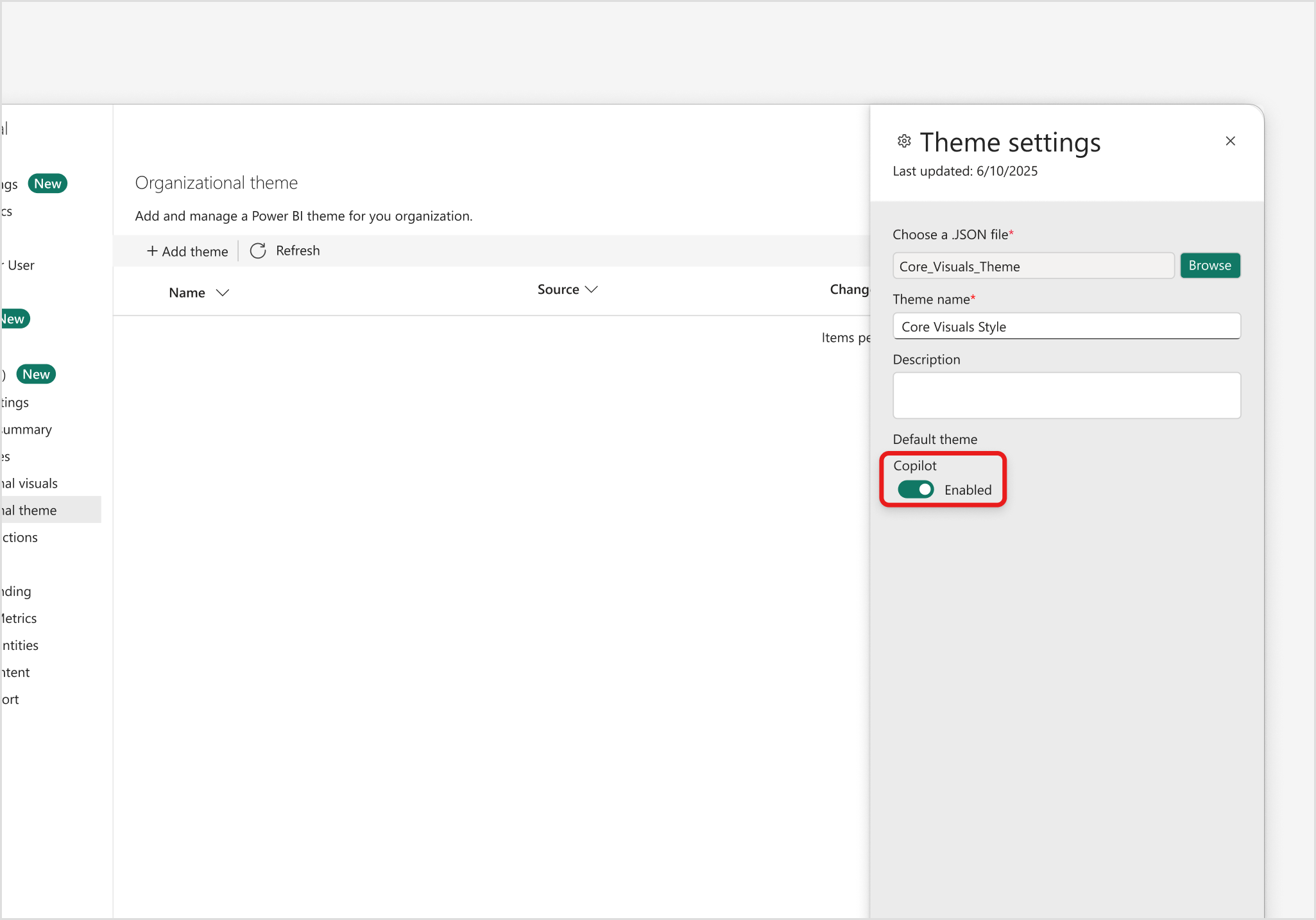 När du laddar upp eller redigerar ett organisationstema i administratörsportalen kan administratörer aktivera Copilot-växlingsknappen. Den här inställningen avgör om det valda temat används av Copilot när det genererar den första sidan i en ny rapport.
