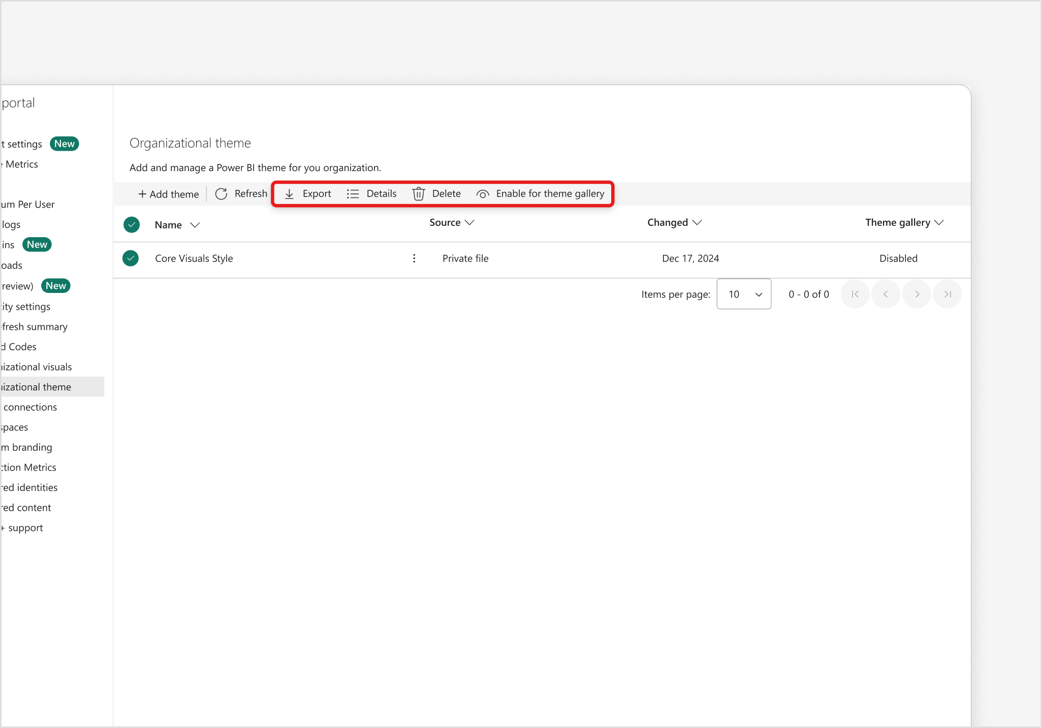 Att lägga till ett nytt organisationstema i Power BI är en effektiviserad process som utformats för administratörskontroll och styrning. Gå först till administratörsportalen, där ett dedikerat avsnitt för organisationsteman (förhandsversion) är tillgängligt. Det här är den centrala hubben för att hantera alla temarelaterade tillgångar.