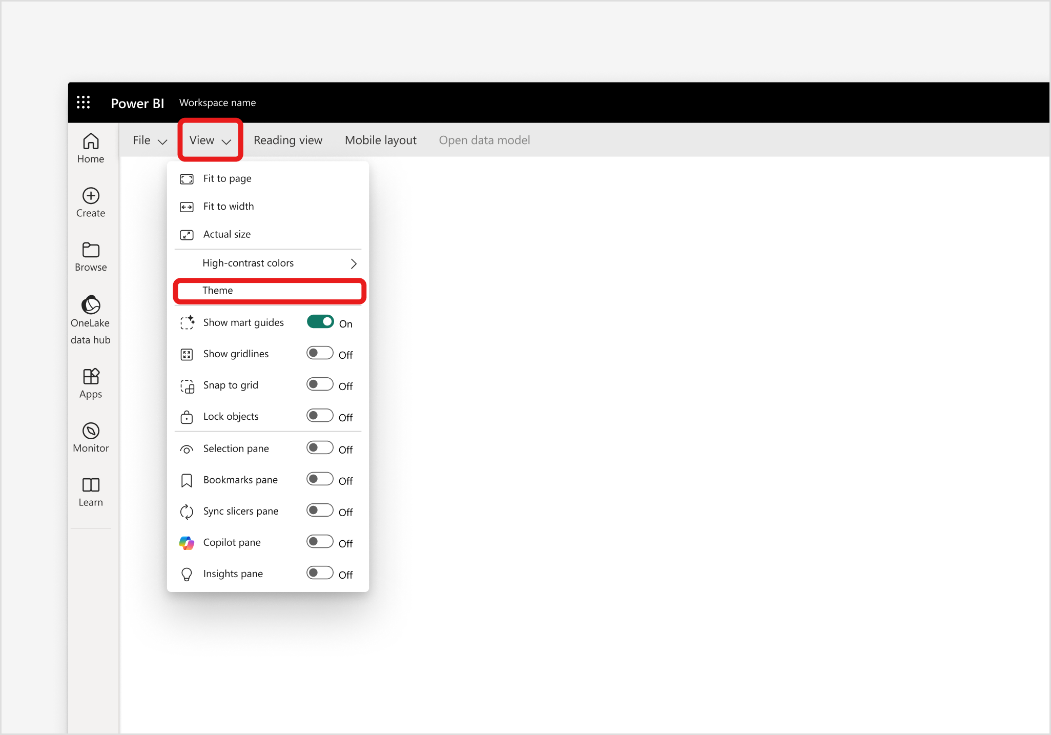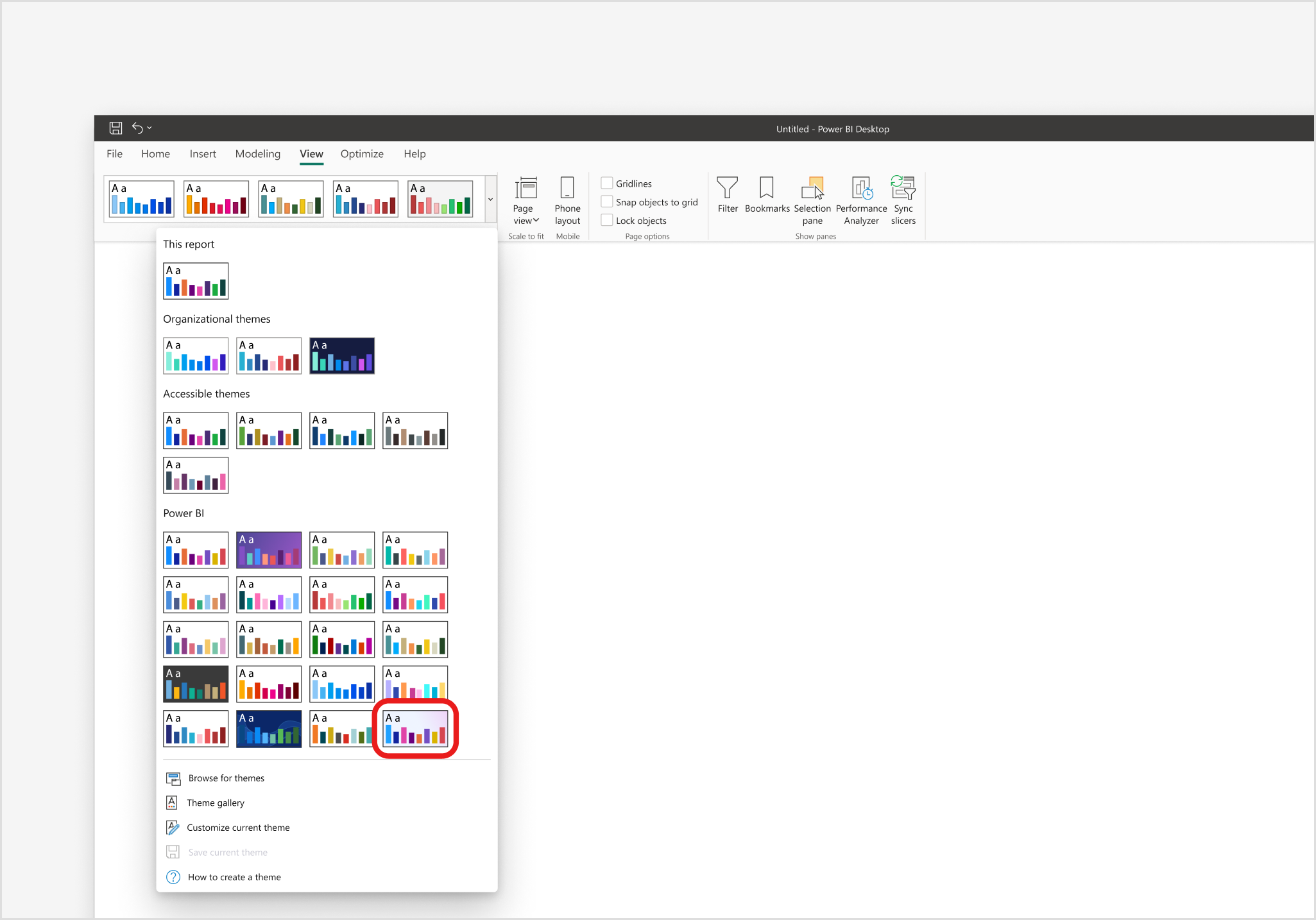 Om du vill komma åt temagalleriet i Power BI-tjänsten går du till fliken Visa i menyfliksområdet och väljer Tema på menyn.