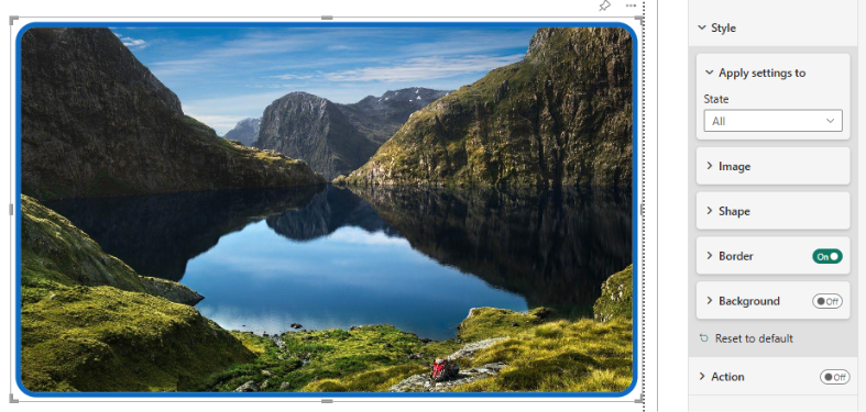 Listrutan Tillämpa inställningar på under kortet Format fungerar med åtgärdskontrollen för att definiera hur det visuella bildobjektet beter sig och visas under användarinteraktion. När du aktiverar en åtgärd, till exempel Sidnavigering eller att öppna en webb-URL, blir bilden interaktiv. Dess visuella format kan ändras beroende på interaktionstillståndet. Du kan till exempel använda hovringstillståndet för att markera bilden med en kantlinje eller skugga när en användare hovrar över den, eller det pressade tillståndet för att visuellt indikera att bilden har klickats. Dessa formateringstillstånd hjälper till att förstärka bildens roll som ett åtgärdsbart element, vilket ger visuell feedback som förbättrar användbarhet och tillgänglighet. Genom att anpassa varje tillstånd skapar du en mer intuitiv och dynamisk upplevelse för rapportanvändare.