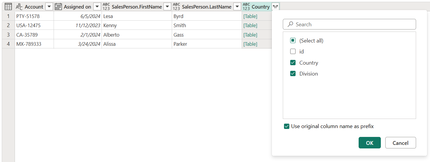 Välj expandera-ikonen bredvid kolumnrubriken Land . På menyn expandera kolumner väljer du endast fälten Land och Division . Kontrollera också att Använd det ursprungliga kolumnnamnet som prefix är markerat.