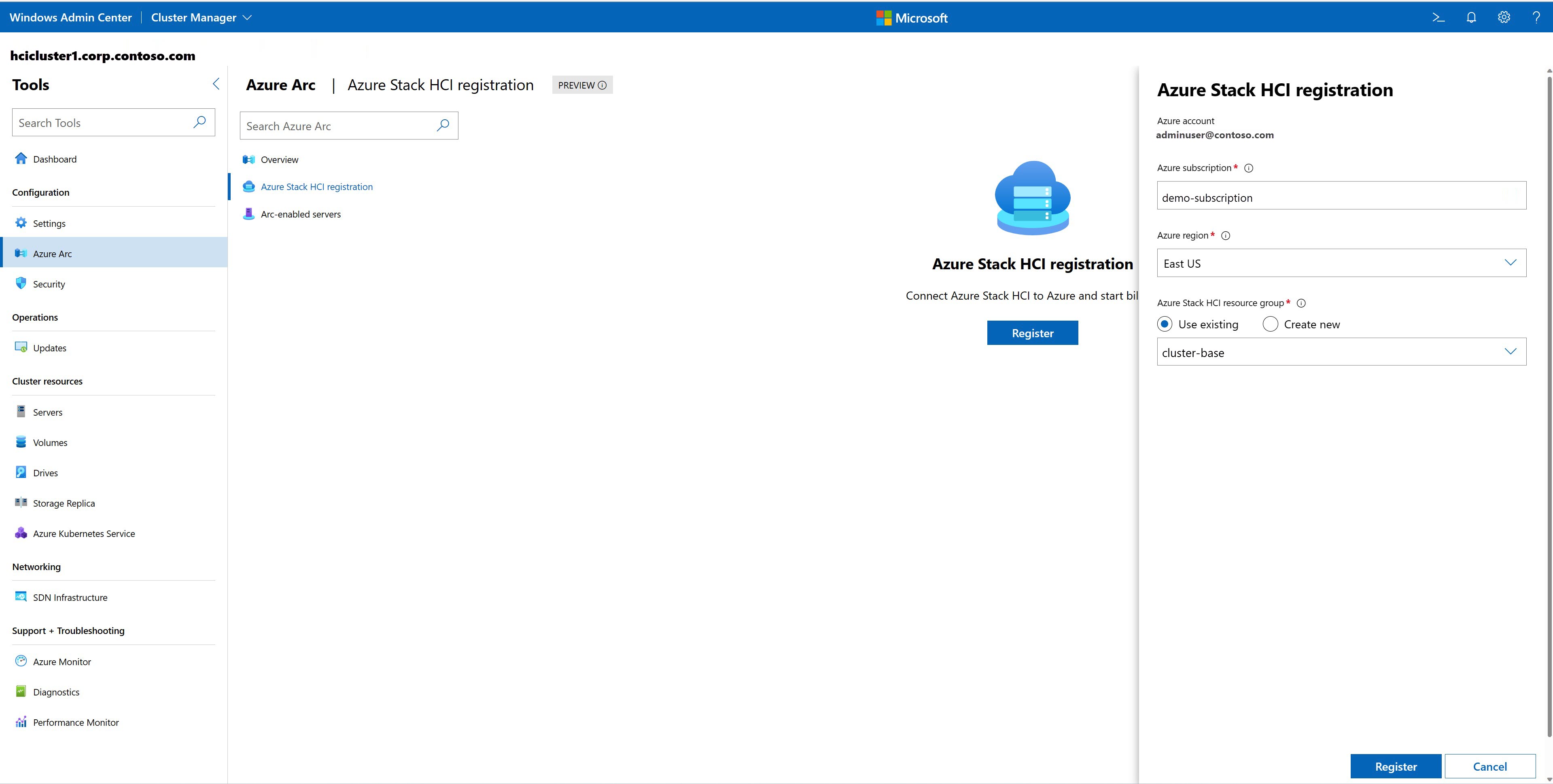 If your cluster isn't registered, under Azure Stack HCI registration, select Register to proceed.