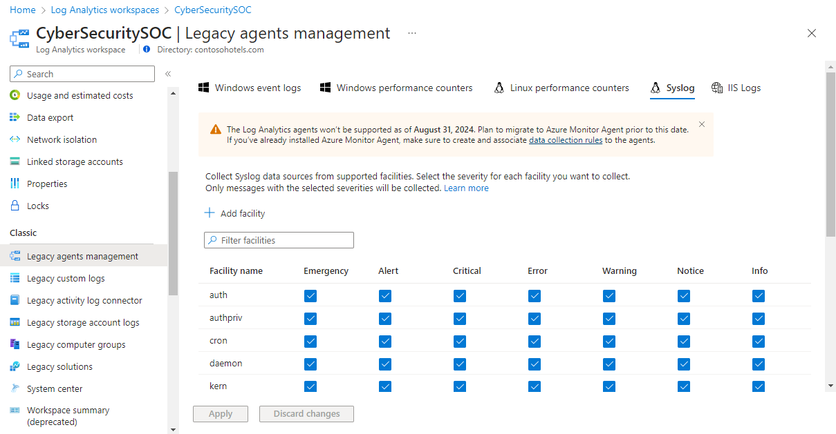 Log Analytics-agenten för Linux samlar bara in händelser med de resurser och allvarlighetsgrad som anges i dess konfiguration. Du kan konfigurera Syslog via Azure-portalen eller genom att hantera konfigurationsfiler på dina Linux-agenter.