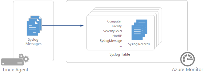 Syslog är ett protokoll för händelseloggning som är gemensamt för Linux. Program skickar meddelanden som kan lagras på den lokala datorn eller levereras till en Syslog-insamlare. När Log Analytics-agenten för Linux har installerats konfigureras den lokala Syslog-daemonen för att vidarebefordra meddelanden till agenten. Agenten skickar sedan meddelandena till Azure Monitor där en motsvarande post skapas.