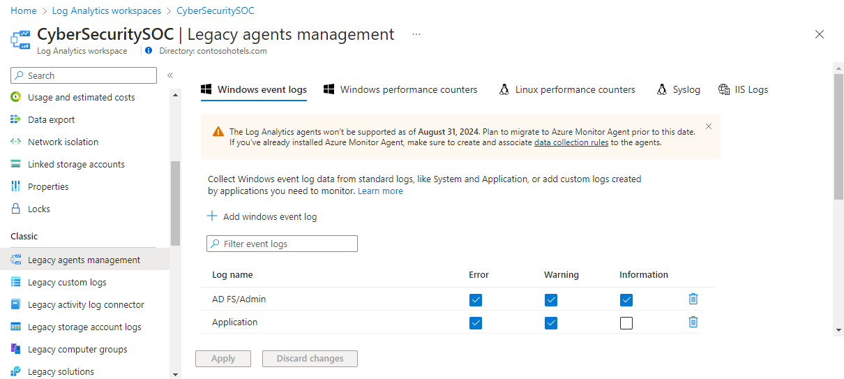 Konfigurera Windows-händelseloggar från menyn Hantering av äldre agenter för Log Analytics-arbetsytan.