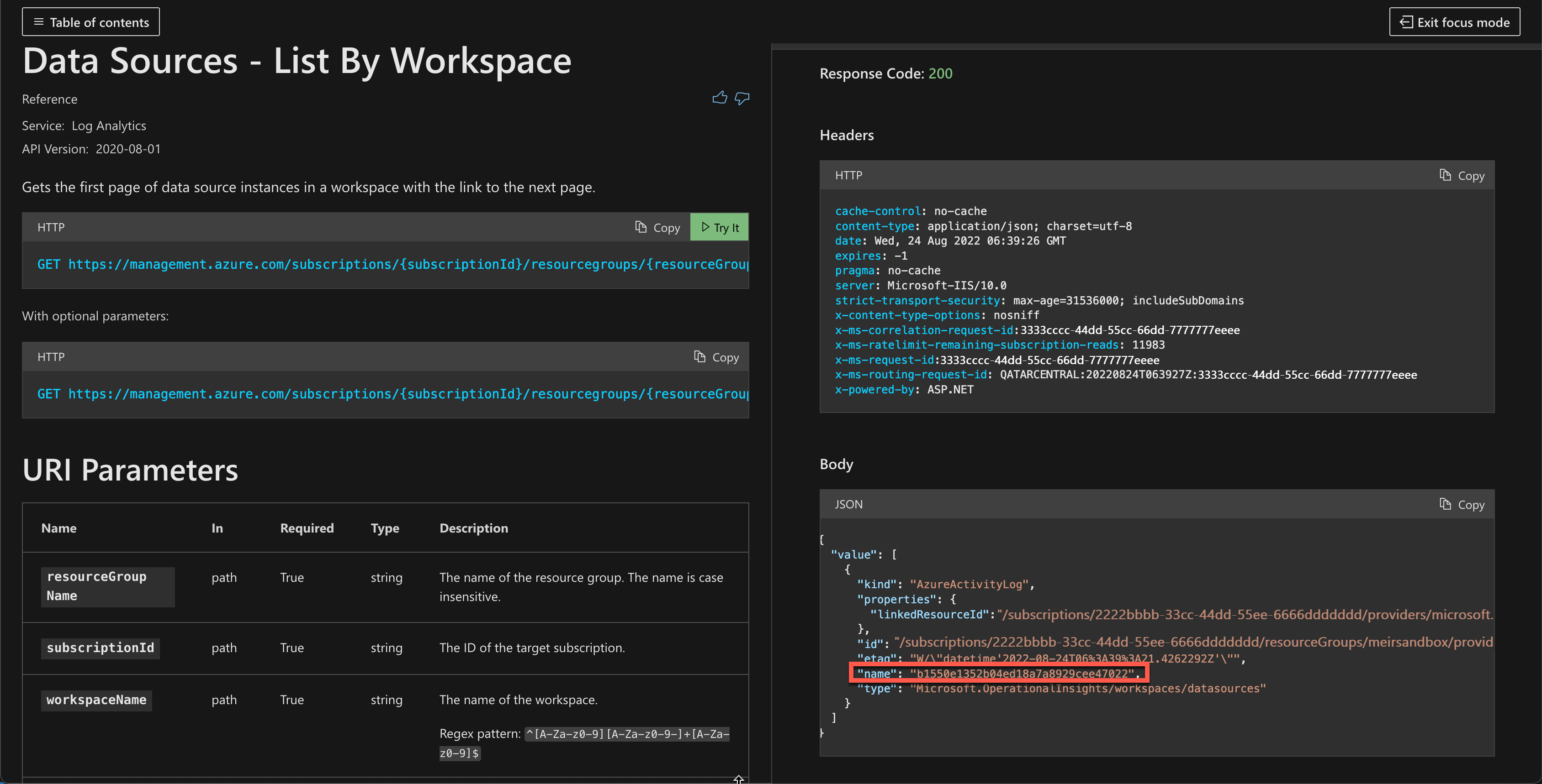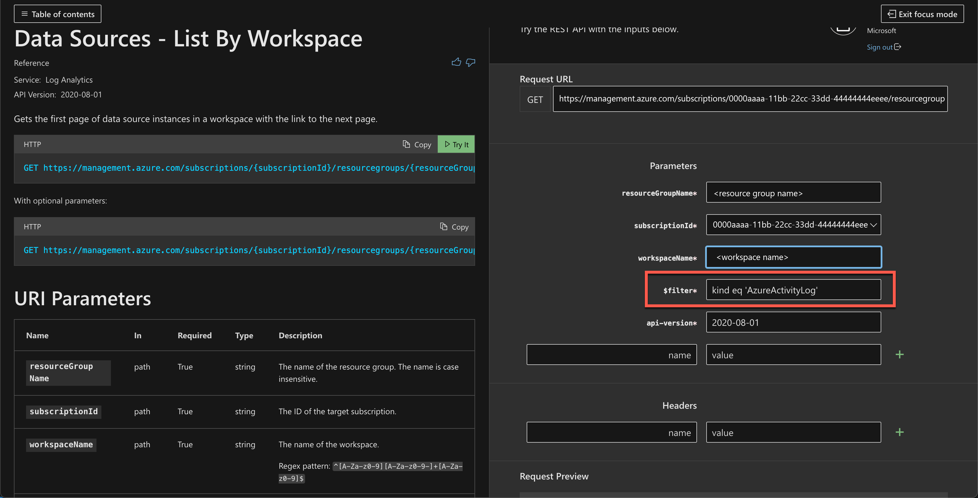 Visa en lista över alla datakällor som är anslutna till arbetsytan med hjälp av API:et Datakällor – Lista efter arbetsyta och filtrera efter aktivitetsloggar genom att ange