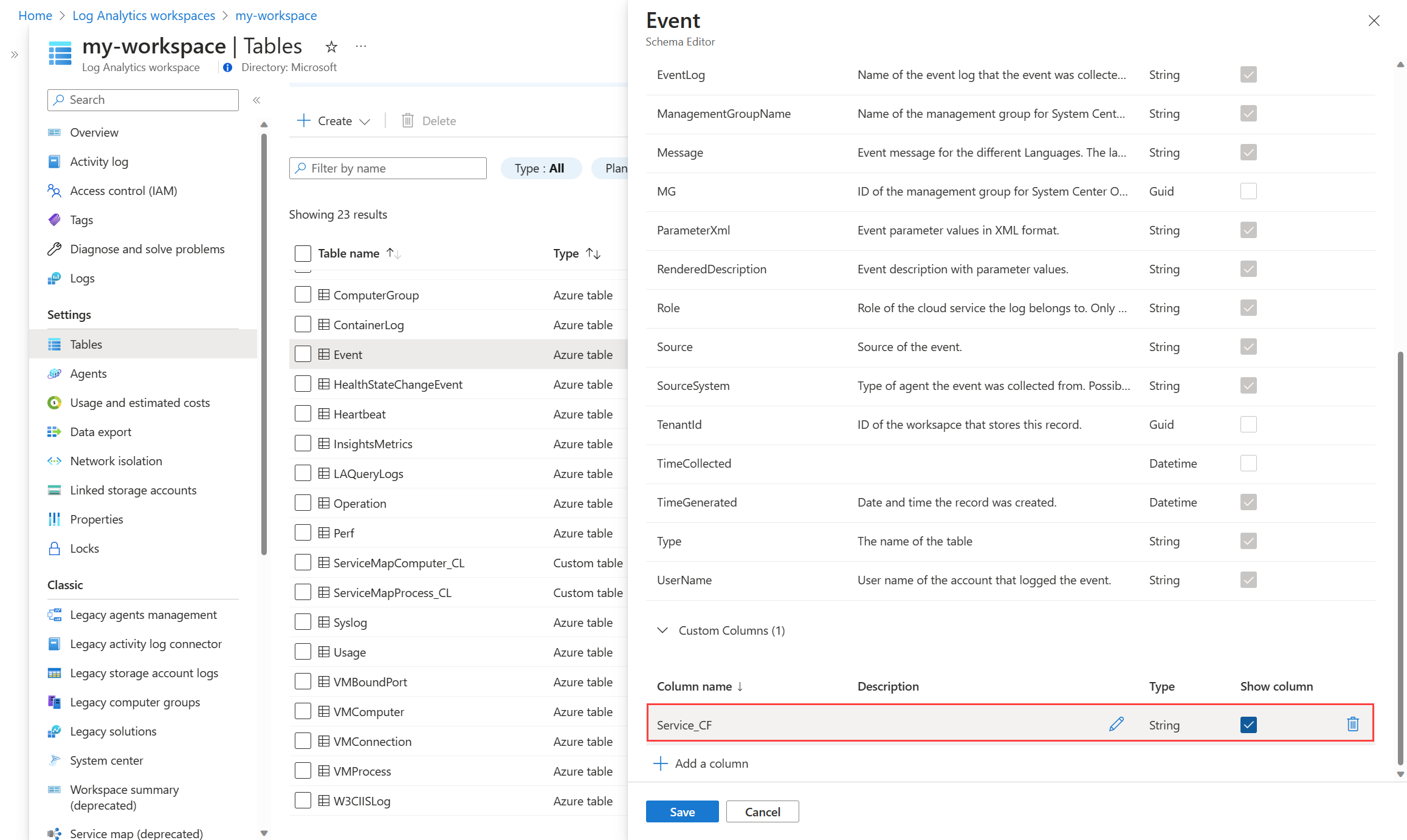 - Log Analytics-arbetsyta med en tabell som innehåller anpassade fält