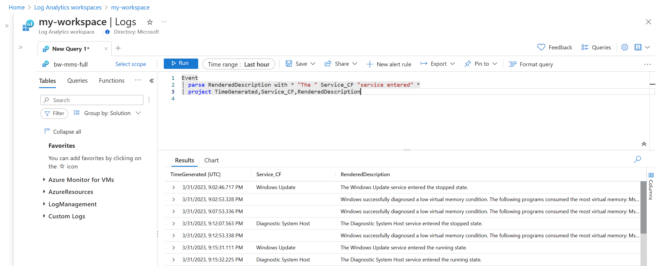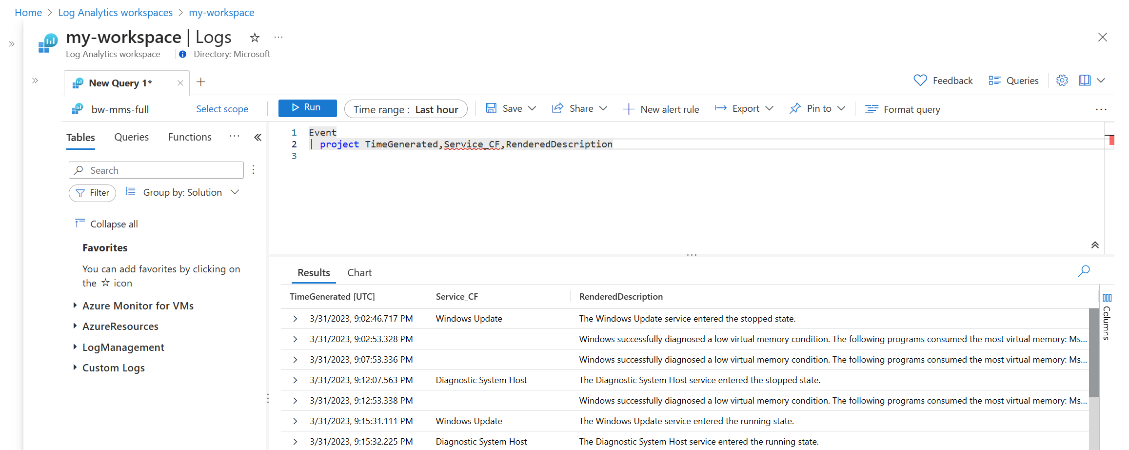 Välj Loggar på sidomenyn och kör en fråga för att hämta ett exempel på data från tabellen.