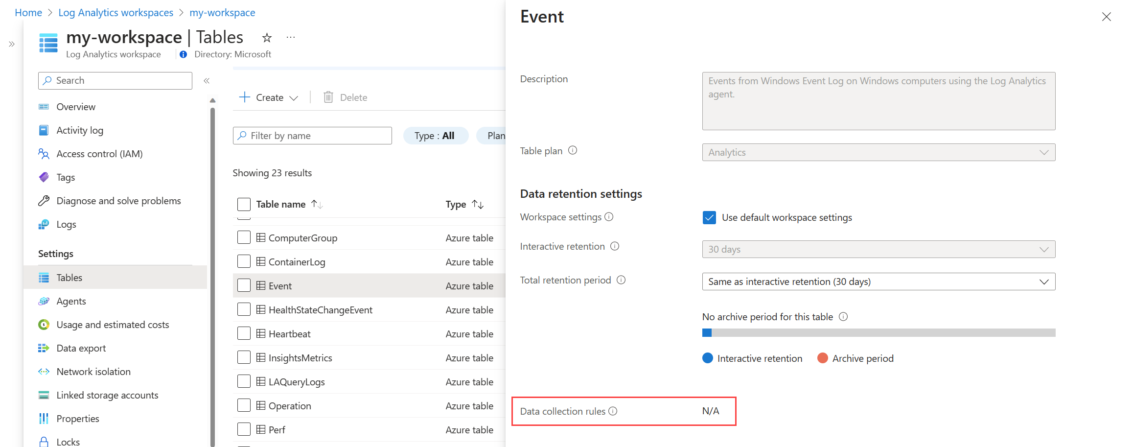transformKql. - För resursloggar som samlas in med diagnostikinställningar lägger du till transformeringen till arbetsytans standard-DCR. Tabellen måste ha stöd för transformeringar.