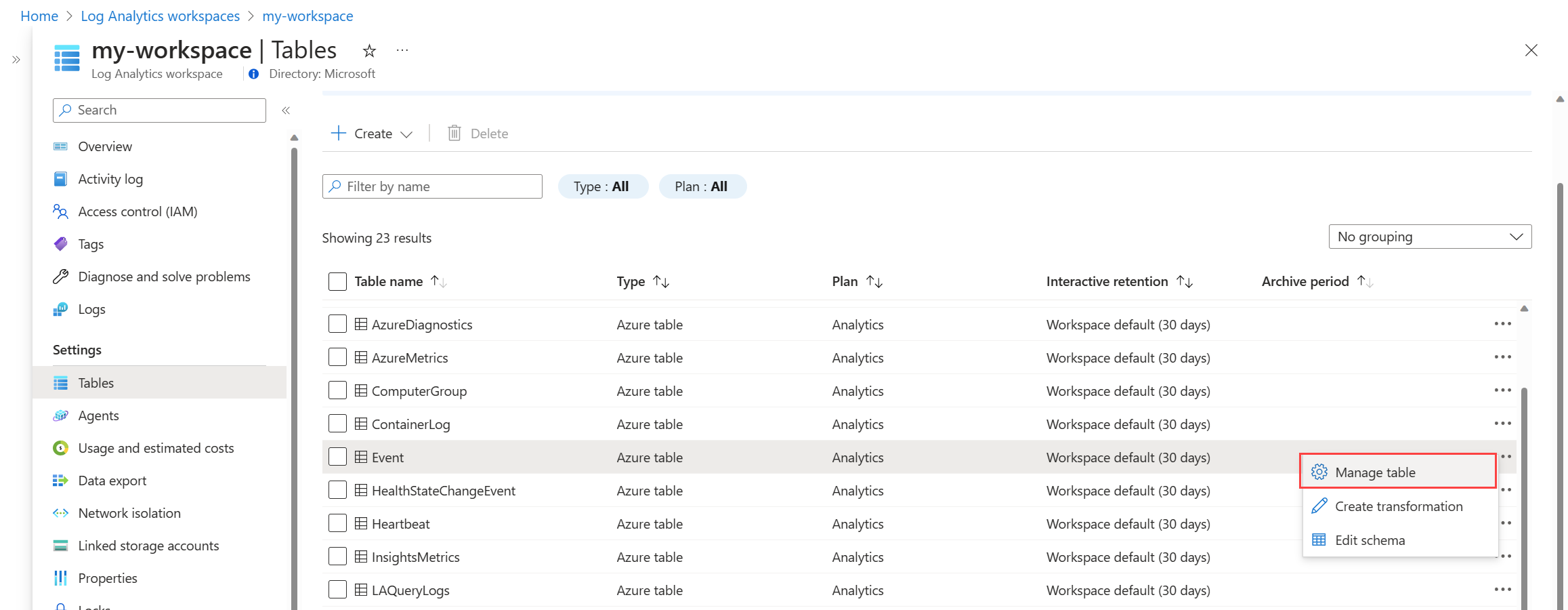 Gå till Log Analytics-arbetsytan där tabellen med anpassade fält finns.