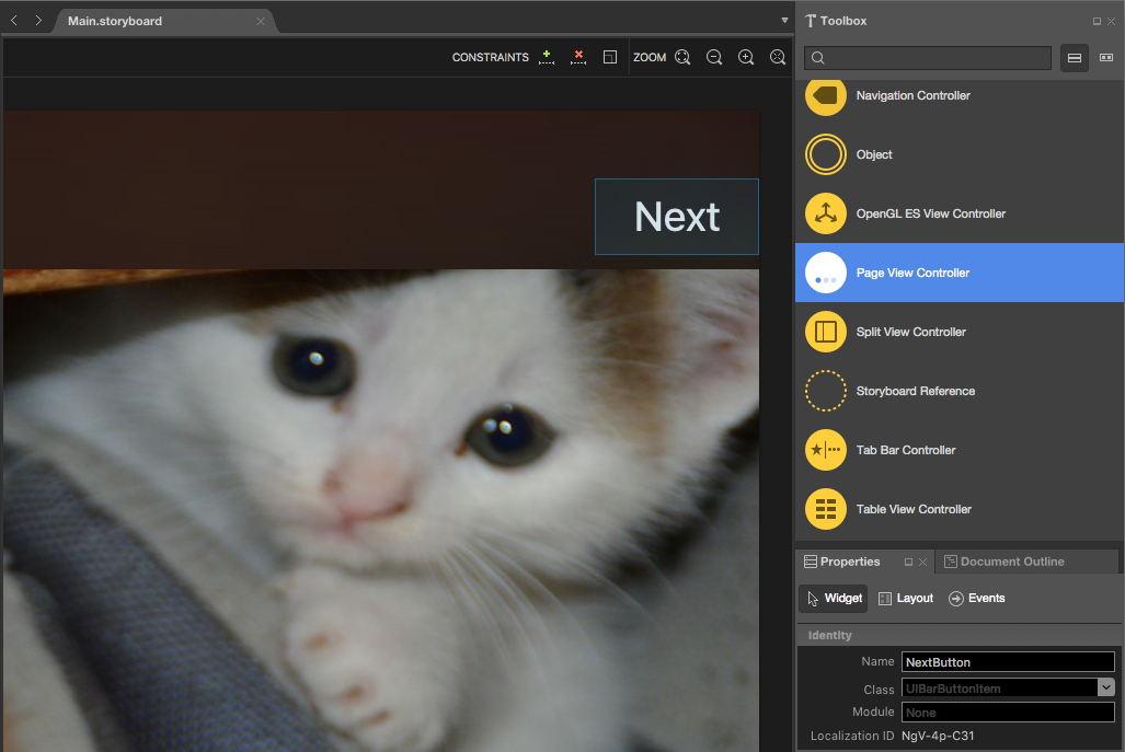 Main.storyboardfile and open it for editing.Drag a Page Control from the Toolbox and drop it on the View: