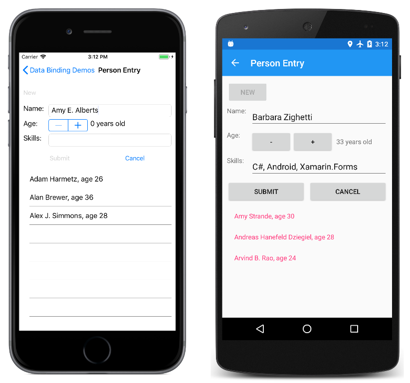 The Person Entry page in the sample program demonstrates some simple commands implemented in a ViewModel.